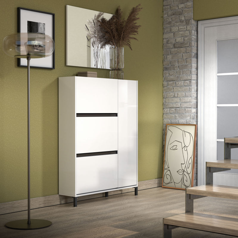 The design includes 3 drop-down doors and 1 plain door, creating a functional solution with 3 internal compartments to keep shoes organized. The glossy white finish, combined with anthracite details, provides an elegant and refined contrast, adding a touch of sophistication to the environment.