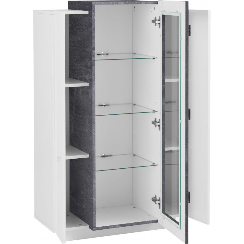 The display cabinet has 2 side doors and a central panel door framed with glass with 4 shelves inside behind the side doors and 3 glass shelves behind the central part.
