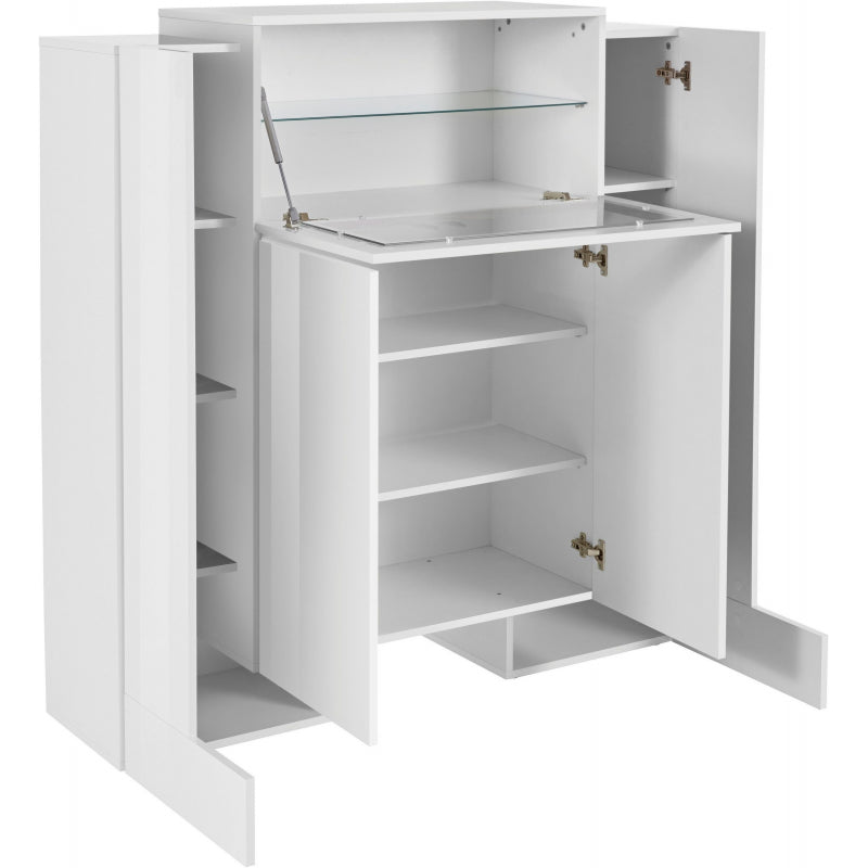 The central structure has two hinged doors with two wooden shelves inside and a frame door with a glass shelf inside.