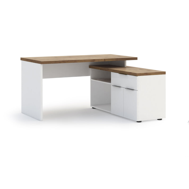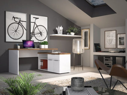 Il design in bianco lucido con il top in finitura rovere conferisce alla scrivania un aspetto luminoso, elegante e contemporaneo, perfetto per creare un ambiente di lavoro accogliente e professionale. La combinazione di colori è versatile e si adatta a una vasta gamma di stili di arredamento, consentendo una facile integrazione con altri mobili e complementi d'arredo presenti nella stanza.